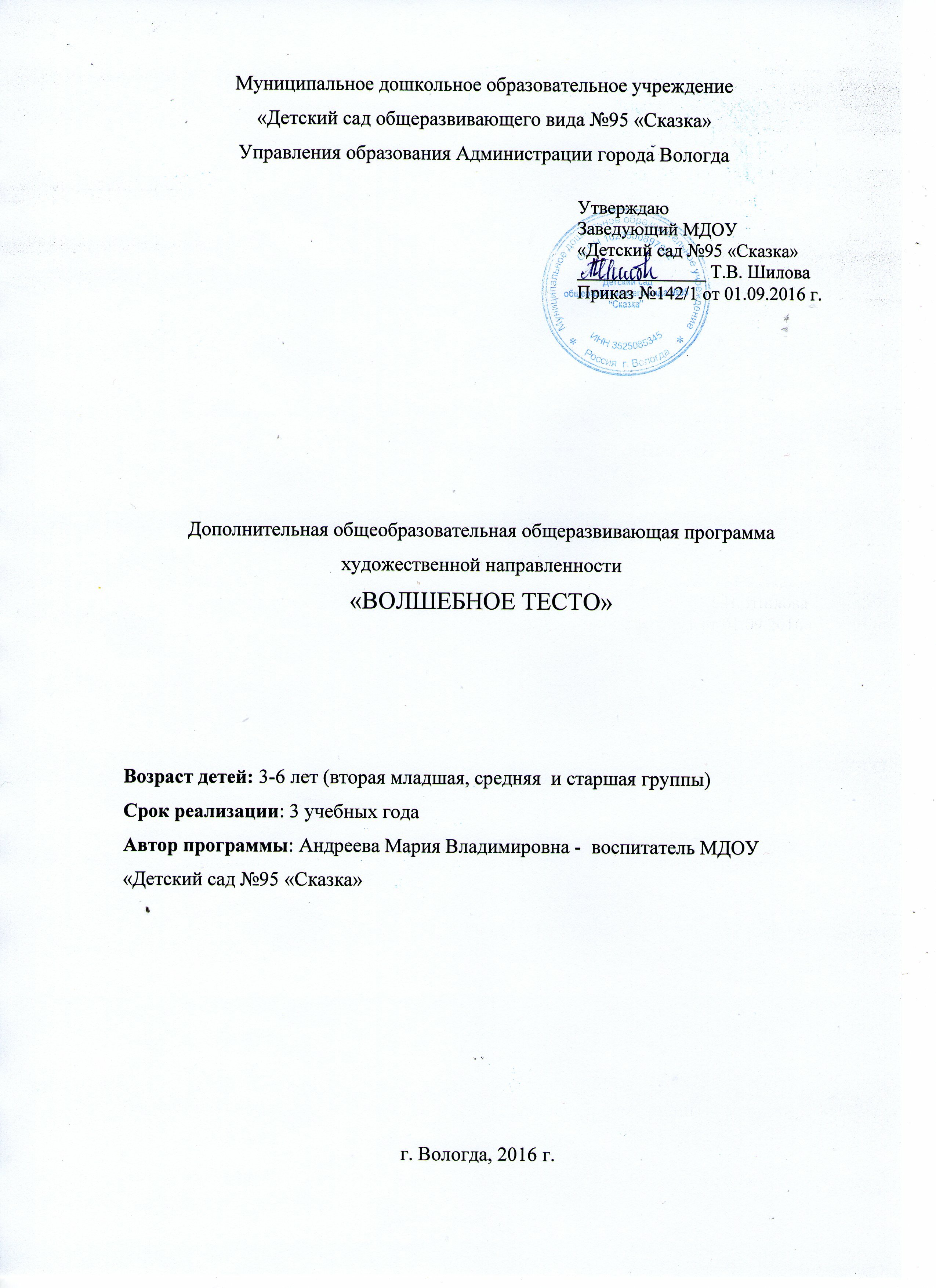 ![]() Содержание 1. Пояснительная записка 3 1.1. Направленность 3 1.2. Новизна 3 1.3. Актуальность 4 1.4. Педагогическая целесообразность 5 1.5. Цели и задачи 6 1.6. Отличительные особенности 6 1.7. Возраст обучающихся 7 1.8. Сроки реализации 8 1.9. Формы и режим занятий 8 1.10. Ожидаемые результаты 9 1.11. Формы подведения итогов 9 2. Организационно-педагогические условия 10 2.1. Материально-технические условия 10 2.2. Требования к педагогическим работникам 10 3. Учебный план 11 3.1. Рабочая программа модуля «Волшебное тесто» дети 3-4 лет 11 - пояснительная записка 11 - содержание программы 12 - перспективное планирование модуля 12 3.2. Рабочая программа модуля «Волшебное тесто» дети 4-5 лет 26 - пояснительная записка 26 - содержание программы 26 - перспективное планирование модуля 27 3.3. Рабочая программа модуля «Волшебное тесто» дети 5-6 лет 41 - пояснительная записка 41 - содержание программы 41 - перспективное планирование модуля 41 4. Календарный учебный график 55 4.1. Календарный учебный график модуля «Волшебное тесто» дети 3-4 лет 55 4.2. Календарный учебный график модуля «Волшебное тесто» дети 4-5 лет 55 4.3. Календарный учебный график модуля «Волшебное тесто» дети 5-6 лет 56 5. Оценочные и методические материалы 57 5.1. Методические материалы 57 5.2. Методы и приемы оценивания 58 6. Список используемой литературы 59 1. Пояснительная записка 1.1. Направленность. Дополнительная общеобразовательная общеразвивающая программа «Волшебное тесто» (далее – Программа) является авторской программой художественной направленности. Дошкольный возраст – яркая, неповторимая страница в жизни каждого человека. Именно в этот период устанавливается связь ребёнка с ведущими сферами бытия: миром людей, природы, предметным миром. Происходит приобщение к культуре, к общечеловеческим ценностям. Развивается любознательность, формируется интерес к творчеству. Для поддержки данного интереса необходимо стимулировать воображение, желание включаться в творческую деятельность. На занятиях по тестопластике у детей развиваются эмоционально – эстетические чувства, художественное восприятие, совершенствуются навыки изобразительного и конструктивного творчества. Программа предполагает формирование ценностных, эстетических ориентиров, художественно-эстетической оценки и овладение основами творческой деятельности, дает возможность каждому воспитаннику открывать для себя волшебный мир искусства, проявить и реализовать свои творческие способности. Отличительной особенностью программы является развитие у детей творческого и исследовательского характера, пространственных представлений, некоторых физических закономерностей, познание свойств различных материалов, овладение разнообразными способами практических действий, приобретение ручной умелости и появление созидательного отношения к окружающему. 1.2. Новизна. Программа «Волшебное тесто» включает занятия по лепке из соленого теста, которые направлены на развитие у дошкольников творчества, определяющиеся как продуктивная деятельность, в ходе которой ребенок создает новое, оригинальное, активизируя воображение и реализуя свой замысел, находя средства для его воплощения. Соленое тесто – один из наиболее доступных материалов для творчества. Но даже самый простой материал полностью раскроет свои возможности только в том случае, если почувствовать его к