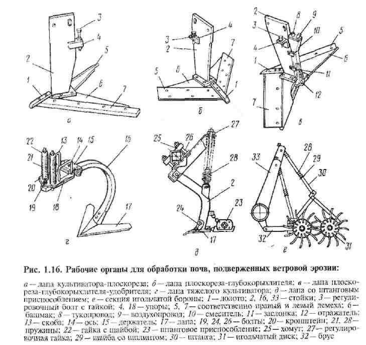 Рабочие органы противоэрозионных почвообрабатывающих орудий — плоскорежущие лапы, штанги и игольчатые диски — различаются технологическим воздействием на почву. Технологический процесс лапы культиватора-плоскореза и плоскореза-глубокорых-лителя (рис. 1.15, а) состоит из следующих операций: подрезание почвенного пласта и корневищ сорняков лезвиями лемехов, подъем и рыхление подрезанного пласта лемешными рабочими поверхностями, укладка пласта по возможности на прежнее место и без повреждения стерни. Под действием сил растяжения и сжатия, возникающих при изгибе пласта во время его вхождения на лемешную поверхность, пласт в определенной мере рыхлится, в нем образуются вертикальные щели, сквозь которые мелкие фракции поверхностного слоя почвы просыпаются во внутренние слои пласта, повышая эрозионную устойчивость поверхностного слоя. В зонах прохода стоек лап плоскорезов элементы пласта более интенсивно разрушаются и перемешиваются, в результате чего некоторая часть стерни заделывается в почву. Кроме того, часть пласта, ударяясь о боковые поверхности стоек, отбрасывается в стороны. С увеличением рабочих скоростей (свыше 7 км/ч) разбрасывание почвы возрастает, в зоне прохода стоек образуется широкая борозда (более 20 см), часть стерни засыпается почвой, вынесенные на поверхность нижележащие влажные слои ее иссушаются, почва теряет влагу. Наилучшего качества обработки достигают при оптимальной влажности почвы 15...22 %. При низкой влажности образуются большие глыбы. Штанга (рис. 1.15, б) вращается в почве на глубине 5...10 см. При этом она разрывает или выдергивает и выносит на поверхность корни сорняков и часть заделанной в почву стерни, рыхлит почву и выравнивает поверхность поля, что весьма важно, особенно в местах прохода стоек лап плоскорезов и глубокорыхлителей. Одновременно происходит сепарация почвенных агрегатов: мелкие пылеватые частицы просеиваются внутрь пласта, а крупные, эрозионно устойчивые выносятся на поверхность. При низкой влажности и повышенной твердости почвы штанга может быть заглублена только после обработки почвы лапами плоскорезов или глубокорыхлителей. Штанга может быть приводной или бесприводной. На пути длиной 1 м она делает 0,9...1,2 оборота. Игольчатые бороны применяют для поверхностного рыхления почвы при весеннем закрытии влаги и осенней обработке почвы по стерне. Обычные зубовые бороны не могут быть применены для этих целей, так как они забиваются пожнивными остатками. При качении диска (рис. 1.15, в) под некоторым углом атаки иглы поочередно внедряются в почву на устанавливаемую глубину, деформируя почву торцовой и боковой поверхностями. В результате образуется лунка, форма сечения которой на поверхности поля напоминает эллипс. При необходимости разрушения почвенной корки с сохранением стерни диски устанавливают так, чтобы они работали «затылком», т. е. во время погружения в почву были направлены вогнутостью вперед. При этом сохраняется до 75 % стерни и одновременно заделываются в почву семена сорняков. Конструкции рабочих органов, предназначенных для предотвращения ветровой эрозии почвы, представлены на рисунке 1.16. Так, лапы культиваторов-плоскорезов используют для обработки почвы на глубину 7...18 см. Их ширина захвата ПО...250 см. Лапа плоскореза-глубокорыхлителя устроена аналогично лапе кул