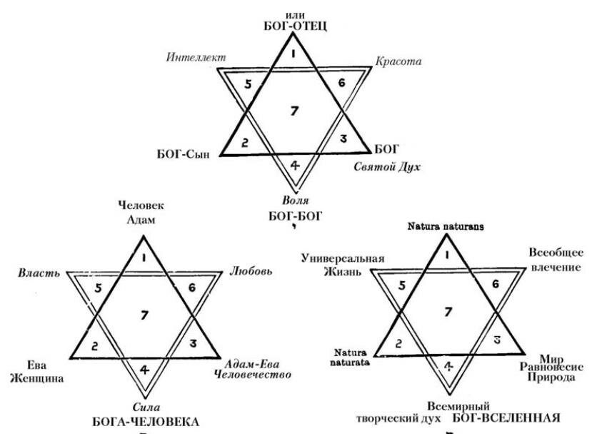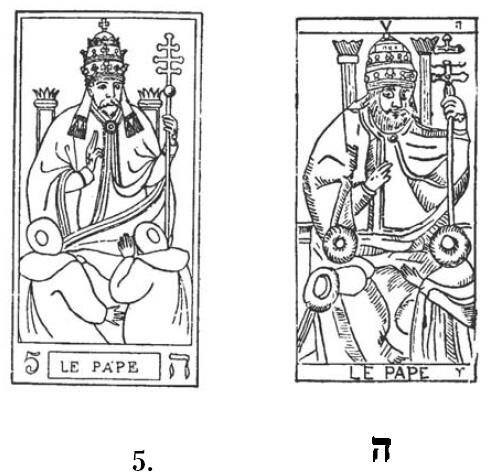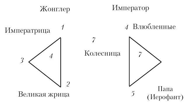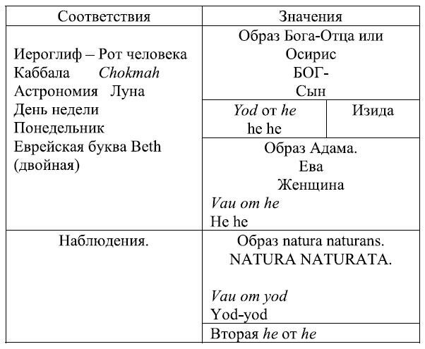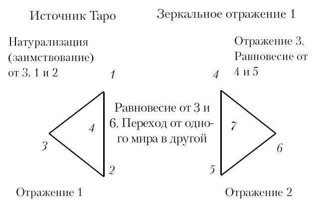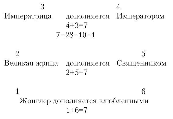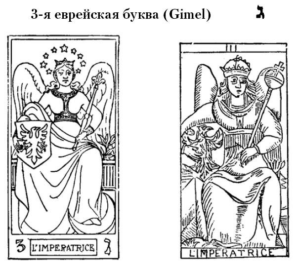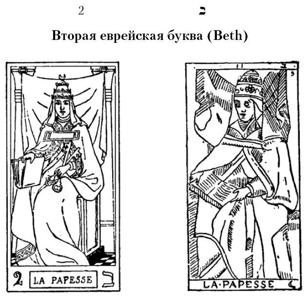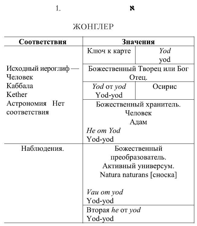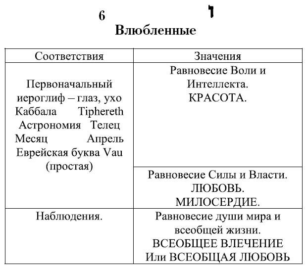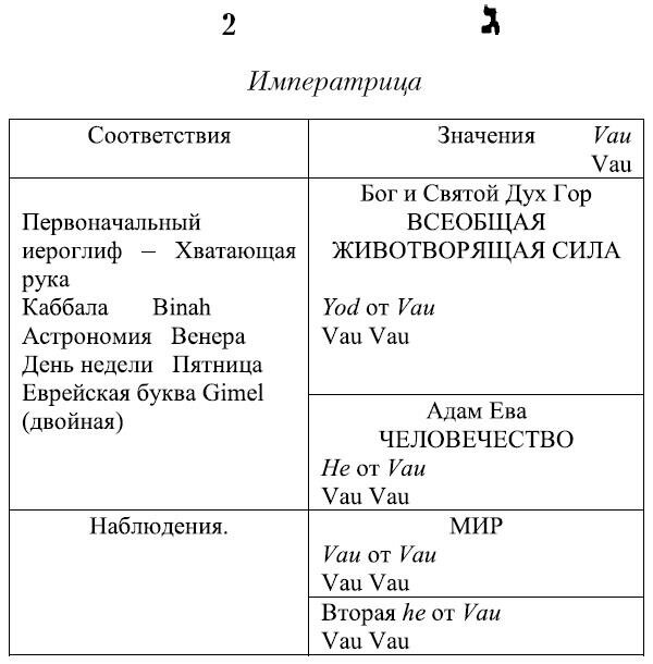 Глава XСимволика Таро: Первая седмица: Арканы с 1 по 7 – ТеогонияПлан работы – Ключ к первой седмице – ПерваЯ карта Таро как источник всех других – Три принципа Абсолюта – Триада – Рисунок первой карты и ее родственники. ВеликаЯ жрица и Beth, Ghimel и Императрица, Daleth и Император, Не или Священник, Vau – Влюбленные, Резюме по первой седмице – Божественный закон.Изучение всех 22 Старших аркановПлан работыПриступим к главному закону символики каждого из 22 Старших арканов. Здесь требуется большее внимание читателя, несмотря на значительный объем изложения рассматриваемой темы. Мы постараемся быть как можно более понятными и поэтому сначала объясним план, который избрали для изучения каждой карты Таро. 1) Начинать будем всегда с иероглифического знака, от которого произошла еврейская буква. Автор, которого мы главным образом будем принимать во внимание в этом вопросе, является Курт де Жебелен. 2) Исходя из особенностей иероглифа, мы будем объяснять образы, которые могут быть постепенно из него выведены и которые характеризуют еврейскую букву, рассматриваемую как знак. Нашими главными авторитетами в этом деле являются Атанасиус Кирхер43 и Фабр д'Оливе. 3) Определив образы, которые означают еврейские буквы, будем искать использование этих образов в символических изображениях Таро. Элифас Леви44, Кристиан45 и Барруа46 будут помогать в наших изысканиях. 4) Наконец, мы определим значение, которое должно быть приписано каждой карте Таро, согласно ее числовому и символическому статусу по сравнению с другими картами, применяя общий закон символики. Эта часть нашей работы является совершенно самобытной. 5) Изучение каждой карты завершится таблицей, сводящей воедино все сказанное. Мы должны предупредить читателя, что чтение одного только краткого вывода будет бесполезно для понимания каждой карты Таро, и лучшим способом будет следовать последовательным объяснениям каждой карты, имея колоду карт Таро перед собой. Завершая вступительную главу, необходимо упомянуть основание, на котором мы устанавливаем астрономические связи каждой карты Таро. Одна из древнейших книг Каббалы, которой мы располагаем, Sepher Yetshirah говорит, что три материнские буквы соответствуют трем мирам, семь дублетов – семи планетам, 12 простых (букв) – 12 знакам Зодиака47. И вот, изучая астрологическую рукопись, опубликованную Кристианом, мы открыли, что числа, приписываемые планетам автором этой работы, в точности согласуются с дублетами еврейских букв, а числа, приписанные двенадцати знакам Зодиака, точно соответствуют 12 простым (буквам). считая, что полное согласие между двумя столь разными по происхождению документами заслуживает нашего серьезного внимания, обозначим для каждой буквы ее астрономическое соответствие. Ключ к первой седмицеРАСПОЛОЖЕНИЕ КАРТ ДЛЯ ИЗУЧЕНИЯ ![]() ХАРАКТЕР ИЗОБРАЖЕНИЙ (обращение) 1 ![]() Первая карта ТароИсточник значений всех другихНаша работа продолжается; если мы знаем точное значение первой карты Таро, то можем раскрыть из нее значения всех других карт. Мы приступаем к этой теме с большими колебаниями. Действительно, надежда выяснить истину осложнена возможностью ошибки, которая может привести к очень серьезным последствиям. Тем не менее, проделанная работа дает нам возможность расшифровать значение символа первой карты Таро почти с математиче