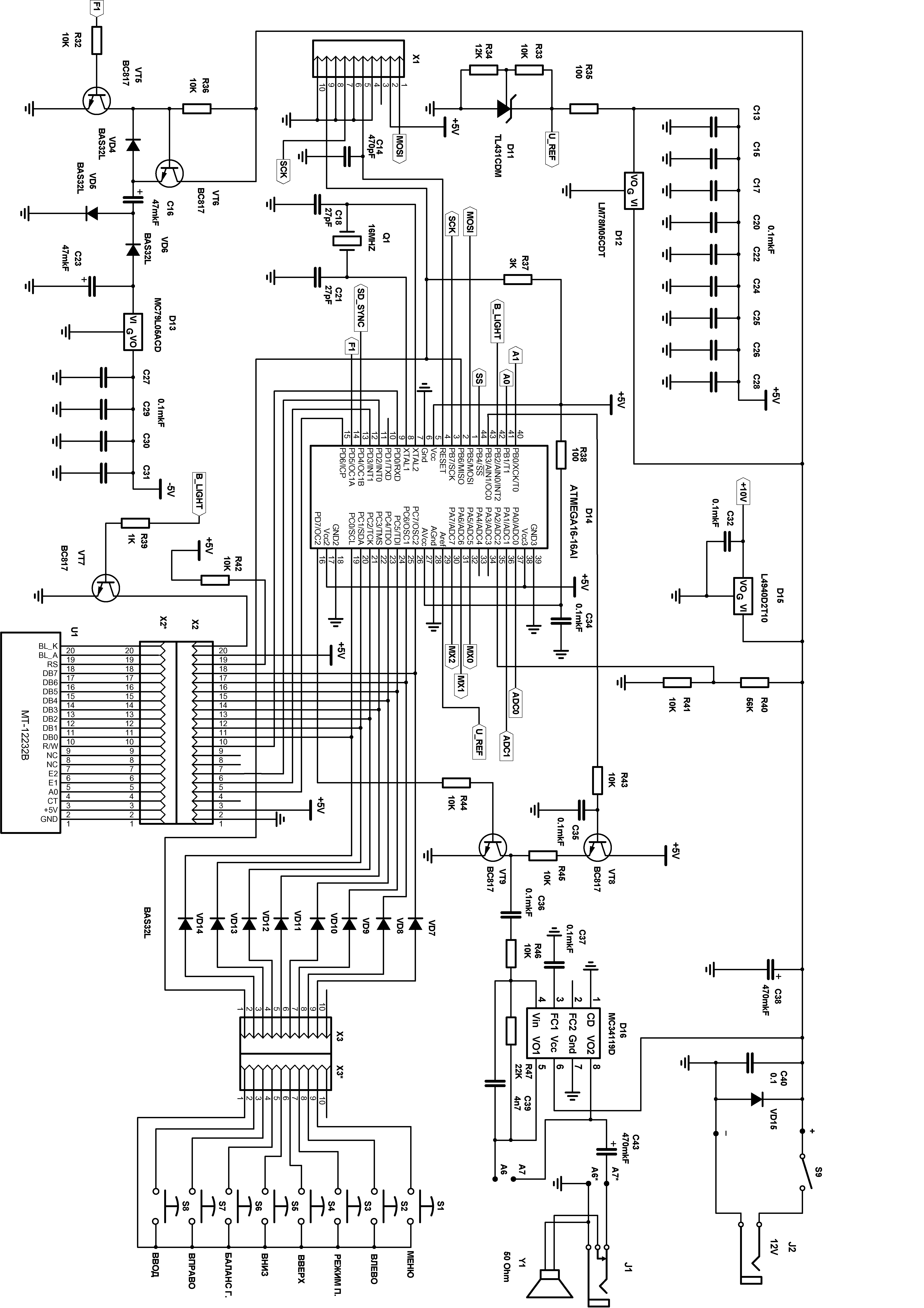 Передающая катушкаШирокополосный выходной усилитель ![]() Микроконтроллер ![]() ![]() ![]() ![]() ![]() ![]() Устройство визуальной индикации Устройство звуковой индикации ![]() ![]() Клавиатура![]() Измерительный усилитель ![]() ![]() ![]() ЦАП ![]() ![]() ![]() ![]() ![]() Рис.1. Структурная схема металлоискателя. Принципиальная схемаПринципиальная схема металлоискателя Кощей-18М изображена на Рис.2 и Рис.3.![]() Рис. 2. Схема принципиальная – часть 1. ![]() Рис. 3. Схема принципиальная – часть 2. Передающий каскад металлоискателя выполнен на микросхемах D1…D3 и транзисторах VT1…VT4 и представляет собой типовую рекуперационную мостовую схему, которая широко применяется, например, в импульсных источниках питания. Микросхема D1 используется для инверсии сигнала. Микросхемы D2,D3 типа IR2104S представляют собой т.н. полумостовые драйверы, которые управляют транзисторами VT1…VT4. В схеме использованы транзисторы типа IRFR1205, которые обладают очень низким сопротивлением (менее 0,1 Ом!) в открытом состоянии. Это необходимо для достижения высокого КПД рекуперации. Электролитические конденсаторы C41,С42 участвуют в процессе рекуперации в качестве аккумулятора энергии. Входной усилитель выполнен на микросхеме D4. В схеме используется малошумящий термостабильный операционный усилитель типа OP27GS. Для управления коэффициентом усиления входного усилителя служит коммутатор D9. Коэффициент усиления может принимать восемь фиксированных значений. Синхронный детектор в этом приборе имеет в своей основе широко известную схему и реализован на операционном усилителе D6 и аналоговом коммутаторе D7. Отличительная особенность этого синхронного детектора – это наличие дополнительного коммутатора D5, который переключает “запоминающие” конденсаторы C6, C7, C9, C10. Благодаря такому включению этот синхронный детектор может осуществлять квазиодновременное квадратурное декодирование одно- или двухчастотного сигнала. Измерительный усилитель D8 и 10-ти разрядный ЦАП D10, который стоит в цепи автоподстройки этого усилителя, позволяют увеличить разрядность аналого-цифрового преобразования сигнала с выхода синхронного детектора. Аналого-цифровое преобразование производится с помощью 10-ти разрядного АЦП, встроенного в микроконтроллер D14. При этом используется сигнал ADC0 непосредственно с выхода синхронного детектора и усиленный сигнал ADC1 с выхода измерительного усилителя. Каскад на микросхеме D11 формирует высокостабильное напряжение величиной около 4,6В, которое используется в качестве опорного для АЦП и ЦАП, а также для цепей смещения измерительного усилителя. Стабилизатор D12 формирует питающее напряжение +5В. Стабилизатор D15 формирует напряжение +10В, которым запитывается передающий каскад. Для формирования напряжения –5В предназначен импульсный преобразователь на элементах VT5, VT6, VD4…VD6 и последующий линейный стабилизатор D13. Импульсный преобразователь работает на той же частоте, что и передающий каскад. Это позволяет существенно уменьшить влияние этого каскада на высокочувствительный приемный тракт. На элементах VT8, VT9, D16 выполнен каскад формирования сигнала звуковой индикации. На транзисторах VT8, VT9 выполнен электронный регулятор громкости. Работает он следующим образом – на RC цепочку R43, C35 подается ШИМ сигнал. В зависимости от скважности ШИМ сигнала будет меняться уровень постоянного напряжения на вых