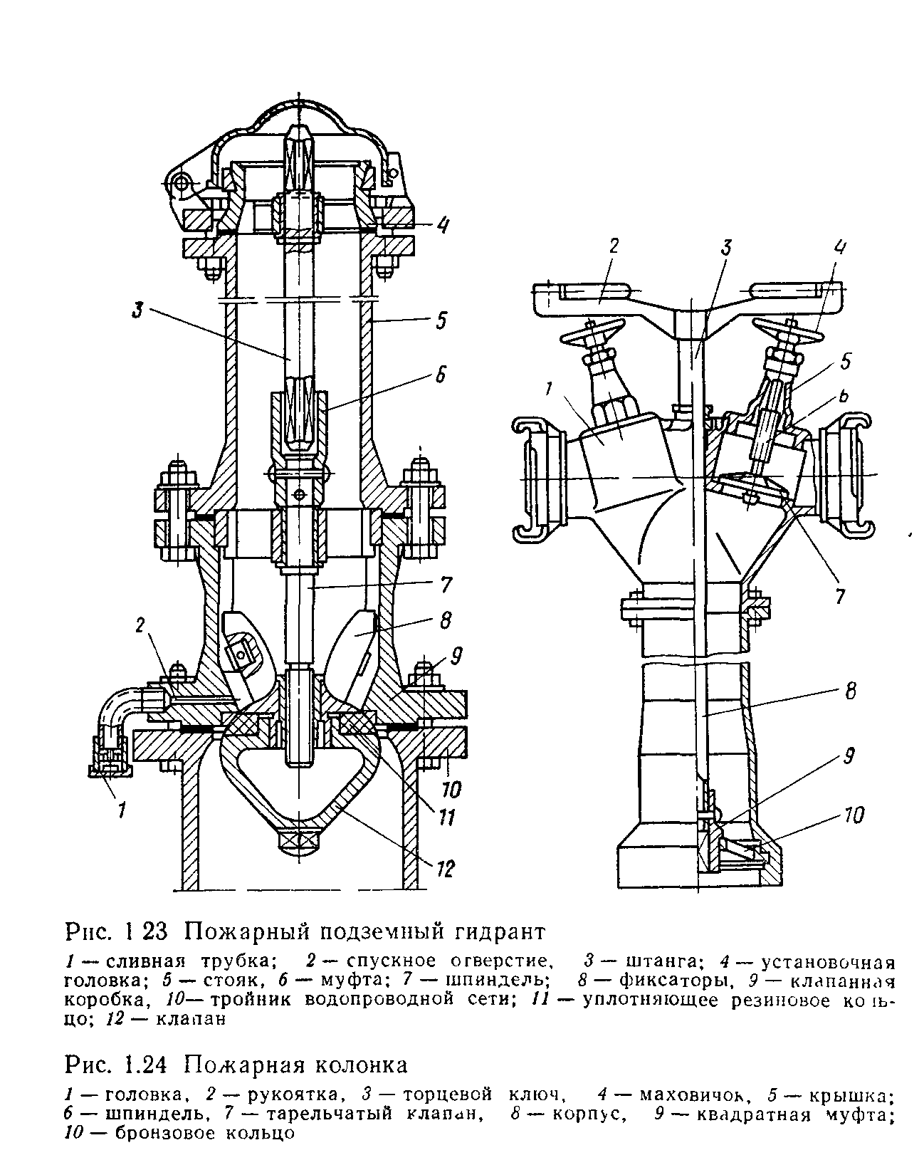 Билет №10 Вопрос 1 Пожарная колонка: назначение, устройство и порядок использования П ожарная колонка предназначена для открывания (закрывания) подземных гидрантов и присоединения пожарных рукавов с целью отбора воды из водопроводных сетей на пожарные нужды.Рис. 2. Основные части пожарной колонки (устройство): 1 – верхний корпус (головка); 2 – рукоятка; 3 – торцевой ключ; 4 – маховик вентиля; 5 – крышка вентиля; 6 – шпиндель вентиля; 7 – тарельчатый клапан вентиля; 8 – нижний корпус; 9 – квадратная муфта ключа; 10 – кольцо резьбовое; 11 – головка соединительная муфтовая (две). Основные технические характеристики пожарной колонки: