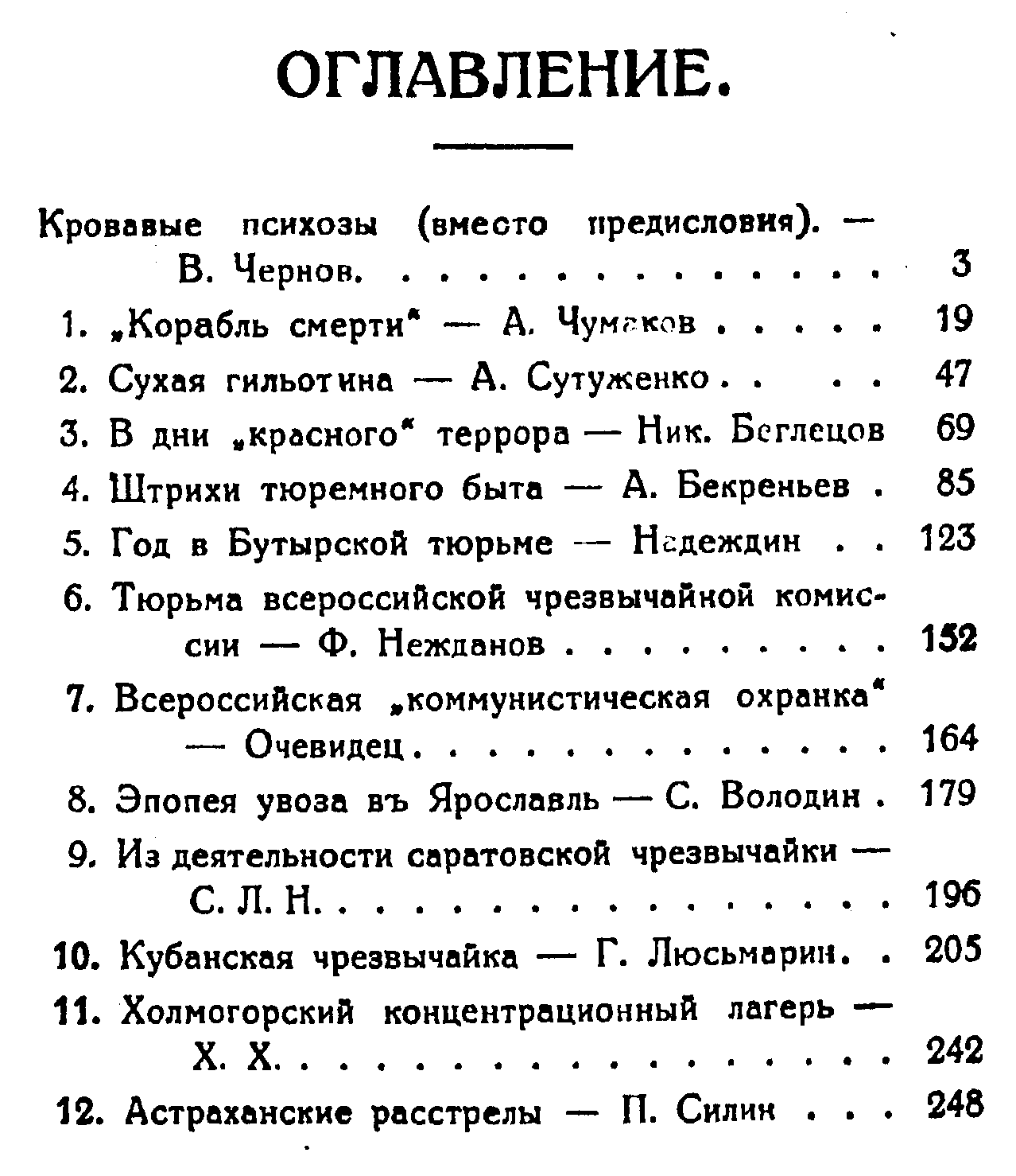Быть может не лишнее будет сказать, что все эти авторы — социалисты, но не все социалисты-революционеры. Нам приходится гарантировать абсолютную правдивость их свидетельств лишь потому, что мы не можем сейчас назвать их имена. Ибо ни в каких посторонних гарантиях они не нуждаются: за них лучшим свидетельством является вся их жизнь, которая при красном терроре большевиков, как и при белом терроре самодержавия, не раз превращалась в сплошное подвижничество.